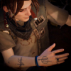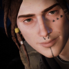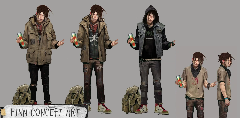 Finn looks like a sentient dust mop, rocking that unkempt aesthetic that's become recognizable among gutter punks. He maintains an undercut that's layered with medium length dreadlocks sparsely embellished with beads and bits of leather. His wardrobe is made up of worn neutrals where every rip is an opportunity to express something with a patch and thread. He's often seen with a bandana around his neck, thick silver bands on his fingers, and corded material worn as bracelets and necklaces.